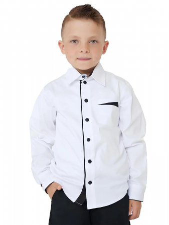Белая приталенная рубашка для мальчика с длинным рукавом, нагрудным карманом и контрастной отделкой. Удобная застежка на кнопках позволяет ребенку легко одеваться самостоятельно. Стильный и аккуратный фасон подойдет для школы, праздников и повседневной носки.