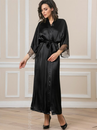 Длинный халат на запах из искусственного атласа с поясом, декорированный кружевом по рукаву.