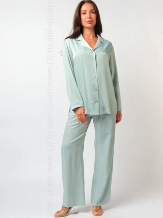 ПИЖАМНЫЙ КОМПЛЕКТ, выполнен из 100% натуральной вискозы шелкового плетения нити. Рубашка свободного прямого кроя с длинными рукавами , с воротником-отворотом, застежка на пуговичках. Брюки с широкими штанинами , с высокой талией, на мягкой резинке, втачные карманы