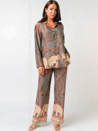 ПИЖАМНЫЙ КОМПЛЕКТ, выполнен из 100% натуральной вискозы шелкового плетения нити. Рубашка свободного прямого кроя с длинными рукавами , с воротником-отворотом, застежка на пуговичках. Брюки с широкими штанинами , с высокой талией, на мягкой резинке, втачные карманы