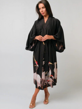 Халат-кимоно выполнен в традиционном японском стиле с широкими, струящимися, длинными рукавами фурисодэ, внутренняя часть рукава выполнена контрастным принтом. Для халата идеально подойдет сорочка арт. 250136