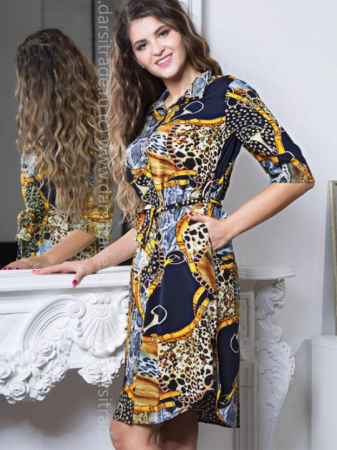 Туника домашняя женская Миа-Миа выполненая из принтованной вискозы. Модель на поясе приталенного силуэта средней длины. Туника рубашечного типа с воротником стойкой и планкой застежкой на пуговицах. Рукав прямой длиной до локтя. В боковых швах изделия карманы.