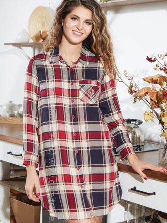Туника домашняя женская из принтованной вискозы. Модель свободного силуета длиной выше колена. Туника с длинным рукавом на манжете и с отложным воротником стойкой. Полочки изделия на планке-застежке с пуговицами. На груди накладной карман с вышивкой. В боковых шах изделия карманы.