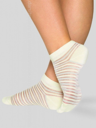 Тонкие комфортные носки с укороченным паголенком. Изделие со сменой полос: чередующиеся прозрачные полоски с полосками с люрексом.