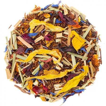 Состав: ройбос, лимонная трава, цедра апельсина, шиповник, каркадэ, василек, лепестки подсолнуха, экстракт грейпфрута, экстракт лайма, аромат лимона.