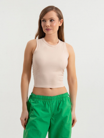 "Женская майка в рубчик из полиамида очень мягкая на ощупь, приятная к телу, хорошо впитывает влагу и не деформируется после стирки.