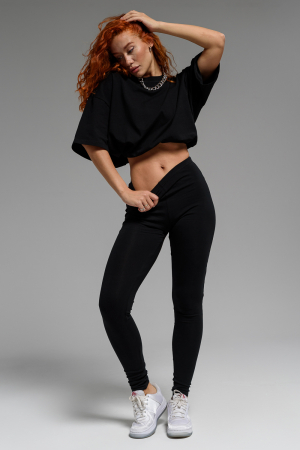 Леггинсы из кулирки с лайкрой. Черная однотонная расцветка, длина до щиколоток, на поясе эластичная резинка.