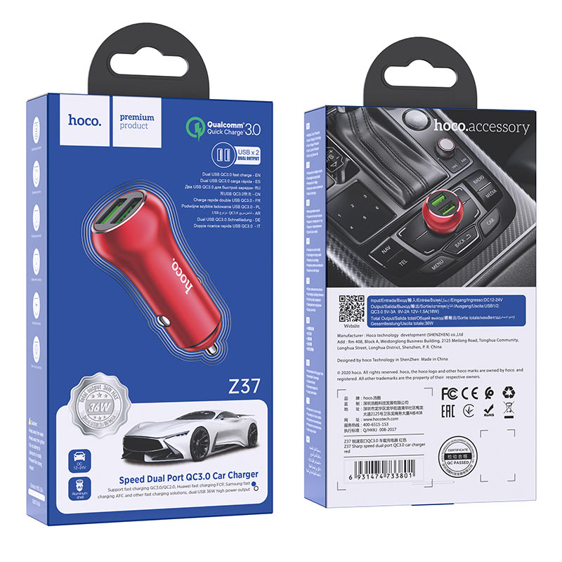 Блок питания автомобильный 2 USB HOCO, Z37 QC3.0, 3000mA, цвет: красный (1/12/120) (арт. 6931474733801)