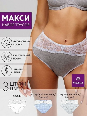 *При покупке набора трусов, ваша выгода может составлять до 100 рублей с одной единицы товара! Чем больше штук в комплекте, тем больше вы экономите! VIVALIA - качественные трусы. Трусы женские высокой посадки моделирую красивую фигуру, подчеркивая линию талии и ягодицы. Классические женские трусы выполнены из мягкого, дышащего хлопкового полотна, дополнена кружевными вставками на передней части. Верхний и нижние края модели обработаны эластичной тесьмой для идеального прилегания. Ластовица двойная, с внутренним слоем из натурального хлопка. Обратите внимание: различия по ширине изделий регулируются контролем качества и соответствуют допустимым нормам ГОСТ. Отделка и фурнитура могут отличаться от представленных на фото.