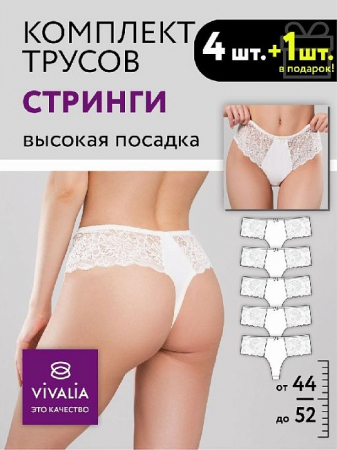 *При покупке набора трусов, ваша выгода может составлять до 100 рублей с одной единицы товара! Чем больше штук в комплекте, тем больше вы экономите! Данная модель трусов представлена как в комплекте, так и по 1 шт. Просим быть внимательнее при заказе и обращать внимание на фото, цену и артикул. Артикул 24796477 поставляется в наборе из моделей разных конструкций (стринги - 1 шт; макси - 1 шт.) VIVALIA - качественные трусы. Трусики из трикотажного полотна и эластичного кружева. Ластовица двойная из хлопка. Талия и вырезы для ног обработаны эластичной тесьмой. Обращаем ваше внимание, что наши изделия проходят обязательный контроль качества, и разница по ширине изделий находится в допустимых пределах согласно требованиям ГОСТ. Узор кружева может отличаться от представленного на фото. Трусы женские, нижнее белье женское, белье женское, белье, нижнее белье, женское белье, женский набор, высокая посадка, большой размер, день рождения, комплект женский, стринги женские, дышащая ткань, кружевные трусы, повседневная носка, хлопок, натуральный хлопок, хб ластовица. Красивые трусы стринги из эластичного трикотажного полотна и роскошного кружева. Трусы женские кружевные смотрятся эффектно, выгодно подчёркивая изгибы женской фигуры. Хлопковые трусики – практичная вещь в гардеробе нижнего белья женского: они подходят под любую одежду, не стесняют движений и обеспечивают комфортный воздухообмен. Трусы женские (хлопок) однотонные смотрятся стильно и лаконично, дарят уверенность в себе и комфорт в течение всего дня. Качественные женские трусы (как и качественное женское белье) – то, что ищет каждая девушка. Женские трусы кружевные с высокой посадкой выглядят сексуально и женственно. Модель можно носить как трусы для беременных, трусы для больших размеров. Продуманная конструкция (разработанная для размеров сайз плюс) делает стринги удобными: они не врезаются в нежную кожу и не оставляют следов на теле. Расширенный размерный ряд с 38 по 58 размер позволит подобрать трусы size plus на любую фигуру. Модель сглаживает силуэт за счет высокой посадки, создавая эффект подтянутого животика. Открытая модель для больших размеров корректирует пропорции фигуры, визуально удлиняя ноги. Трусы женские высокие (трусы с высокой посадкой) – прекрасный подарок на свадьбу, день рождения или другой праздник. Белье кружевное (корректирующее белье большие размеры) – это всегда женственно, красиво и сексуально.