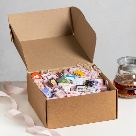 Каждая шоколадка упакована в индивидуальную этикетку с пожеланием.