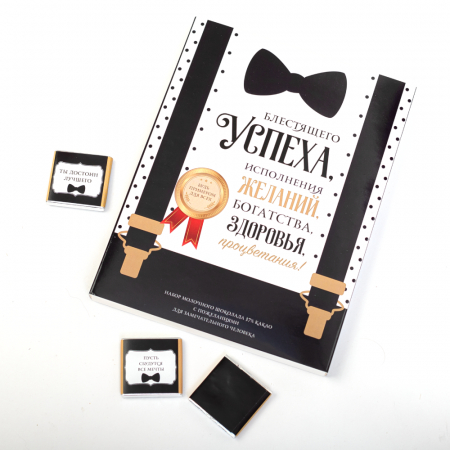 Каждая шоколадка упакована в индивидуальную этикетку с пожеланием.