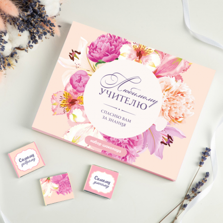 Каждая шоколадка упакована в индивидуальную этикетку с пожеланием.