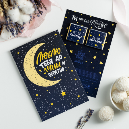 Внутри открытки - 2 шоколадки (вес каждой шоколадки: 5 гр., размер: 31 х 31 мм.)