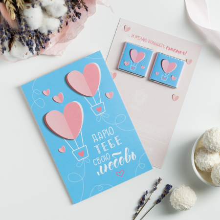 Внутри открытки - 2 шоколадки (вес каждой шоколадки: 5 гр., размер: 31 х 31 мм.)