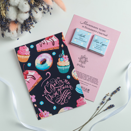Внутри открытки - 2 шоколадки (вес каждой шоколадки: 5 гр., размер: 31 х 31 мм.)