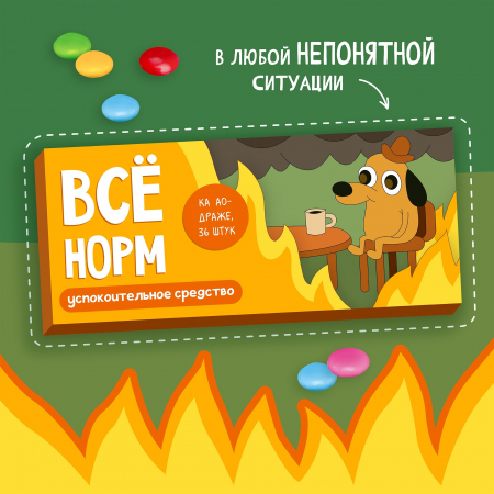 Внутри: 36 разноцветных какао-драже в блистерной упаковке с юмористической инструкцией по применению.