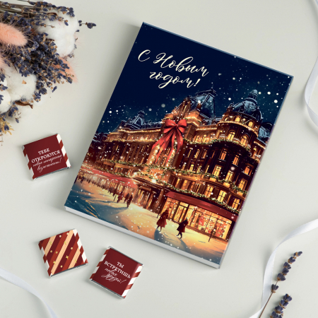 Каждая шоколадка упакована в индивидуальную этикетку с пожеланием.