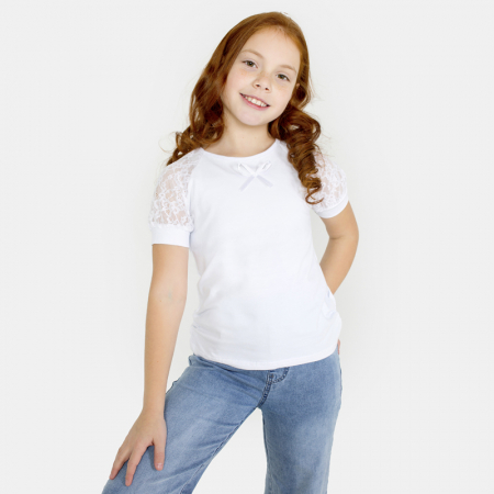 Размерный ряд: 128, 134, 140, 146. Ткань: кулирка с лайкрой плюс гипюр. Состав: 92% хлопок, 8% лайкра.Данная модель отшивается в одной расцветке.