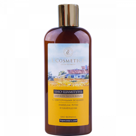 Рецептура шампуня обогащена натуральными гидролатами (цветочными водами) лаванды, розы и календулы.