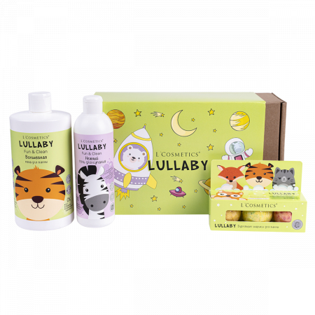 Волшебная пена “LULLABY” Тигр, Нежный гель для купания серии “LULLABY” для детей старше 3-х лет, Набор бурлящих шариков “LULLABY” (зеленый) 55г*3шт. Коробка Подарочная крафт большая, LC | Обечайка LULLABY, Бумага упако