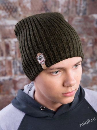 Демисезонная шапка для мальчика школьного возраста. Модель с закрепом. Эластичная за счет вязки в резинку. Двойная.Декорирована шевроном.