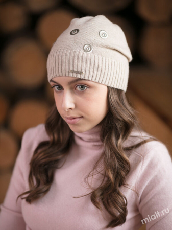 Приятная на ощупь тонкая шапочка из шерсти и кашемира. Декорирована металлическими кольцами и нашивкой «Mialt». Сзади шапки в вертикальный шов вшита этикетка «флажок» c брендом производителя.