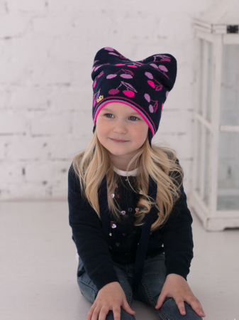 Шапочка для самых маленьких. Головной убор с кроенными ушками с завязками. Хлопковая подкладка. Жаккардовый рисунок в виде вишенок. Красочная и комфортная модель для неусидчивой малышки до 2 лет.