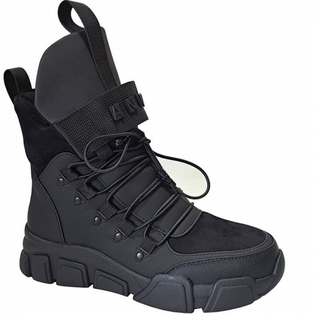 Модель выполнена из экокожи черного цвета и удобно фиксируется на шнуровку. Подкладка и стелька из утепленного баечного текстиля обеспечат тепло и комфорт детским ножкам во время носки.