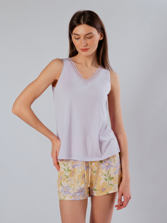 Пижама женская, изготовленная из бамбуко-хлопкового трикотажа, состоит из майки и шорт. Майка сиреневого цвета на широких бретелях. V-образный вырез обрамлен кружевным узором. Шорты, украшенные цветочным принтом, имеют мягкую эластичную резинку на талии и регулирующий шнурок, позволяющий настроить необходимую посадку.