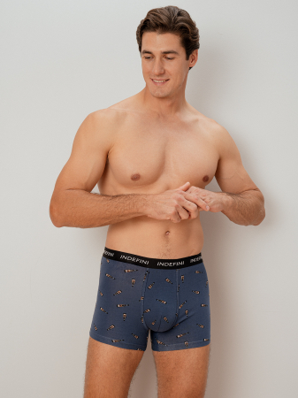 Мужские трусы боксеры зготовлены из хлопкового материала. На талии имеется мягкая эластичная резинка, фиксирующая трусы без давления и не оставляющая следов. Трусы боксеры выполнены в классическом синем цвете и украшены принтом с изображением бутылок.