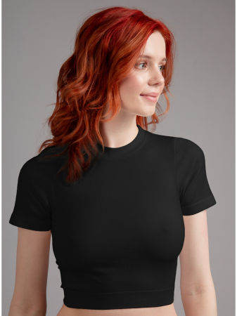 Женский топ от торговой марки Индефини. Топ из полиамида, черного цвета, с короткими рукавами, с небольшим горлом, в рубчик, облегающий, укороченный.