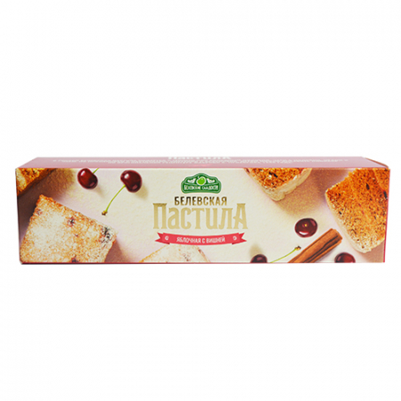 Полностью натуральный продукт, безупречный вкус и необычный аромат которому достаются благодаря старинной рецептуре прошлого века. Тогда не существовало искусственных красителей, консервантов и т.п., а гастрономические качества блюд были результатом работы искусных поваров. Яблоко придает пастиле легкую кислинку, которую выгодно подчеркивает вишня. Она, в свою очередь, окрашивает десерт в розоватый цвет, а душистая корица делает вкус еще более ярким и насыщенным, но вместе с тем свежим и необычным.