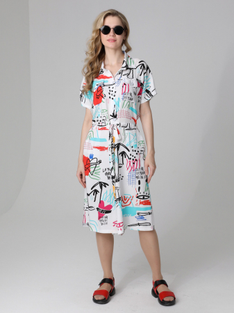 Комбинезон средней длины прямого силуэта с цельнокроеными рукавами. Застежка на петли и пуговицы. Воротник рубашечного типа на стойке. Есть две пары функциональных карманов. Линия талии фиксируется резинкой с поясом. Большой размерный ряд позволяет приобрести комбинезон для женщин и девушек любого возраста и комплекции. Такая одежда имеет свободный покрой, учитывайте это при выборе размера. Комбинезон выполнен из легкой вискозной ткани, позволяющей чувствовать себя комфортно даже в жаркий день! Выбирайте понравившийся цвет, сочетайте обувь и аксессуары и встречайте лето стильной и яркой!