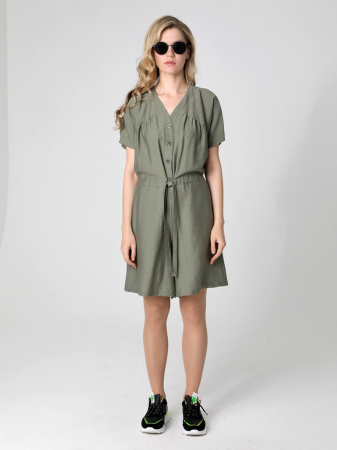 Комбинезон из мягкой "жатой" ткани прямого силуэта с короткими цельнокроеными рукавами. Застежка на петли и пуговицы. Линия талии фиксируется резинкой с поясом. Есть функциональные боковые карманы. Такая одежда имеет свободный покрой, учитывайте это при выборе размера. Выбирайте понравившийся цвет, сочетайте обувь и аксессуары и это комбинезон с шортами выручит Вас жарким летним днем в городе, на прогулке и на отдыхе.