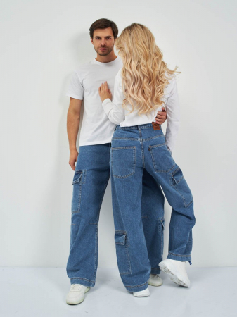 Самые ультрамодные и популярные карго джинсы на сегодня из нашей коллекции для всех . Посадка Baggy fit в этой модели это мешковатые джинсы с высокой талией, широкими штанинами по всей длине. Для получения дополнительного объема спереди под коленом сделаны две вытачки. Рекомендуется носить слегка приспущенными на бедра. По низу штанин вставлен шнур, с помощью которого при затяжке низа можно получить стиль джинсов "парашютов". Линия бокового шва прямая и шов сделан в разутюжку . Застежка на молнии. Выполнены из традиционной хлопковой ткани denim. Классическая средняя стирка "stone wash".