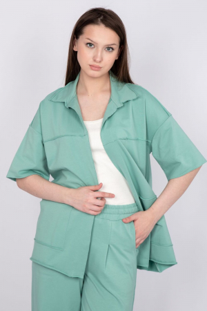 Джемпер женский свободный кроя, со спущенной линией плеча. Горловина круглая обработана классическим воротником с цельнокроенной стойкой из основного полотна. Линия борта обработана подбортом с пробивными кнопками. На полочке отрезная кокетка и накладные карманы с необработанными краем. Вход в карман прорезной. Низ рукава и низ изделия не обработан. Модель рассчитана на рост 164-170