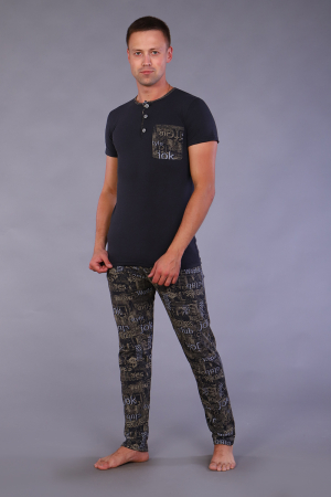 Мужской пижамный костюм футболка с брюками. Брюки полной длины слегка заужены к низу, с вместительными карманами по бокам. Футболка с коротким рукавом модель поло с пуговицами, на груди накладной кармашек.
