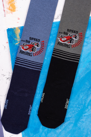 Детские колготки для мальчиков. Носок черный, верх цветной, спереди вывязана гоночная машина