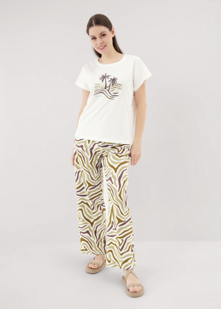 Пижама из трикотажного полотна.Футболка прямого силуэта,короткий цельнокроеный рукав.Округлая горловина с обтачкой.Спереди принт.Сзади средний шов.Боковые разрезы.Брюки с притачным поясом на резинке,шнуром из окантовки.Боковые карманы с отрезным бочком.,