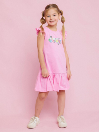 Платье с коротким рукавом для девочек в розовом цвете с принтом на груди. Лёгкое летнее платье из набивного трикотажа супрем. Cтильное, яркое и модное платье выполнено из высококачественного хлопка. Оборка на рукавах и по низу платья.
