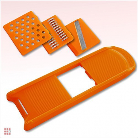 Овощерезка оранжевая, в комплект входят три сменных ножа.