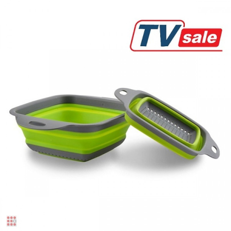 Складной квадратный силиконовый дуршлаг,очень удобный,занимает минимум места,не гремит,можно взять с собой!