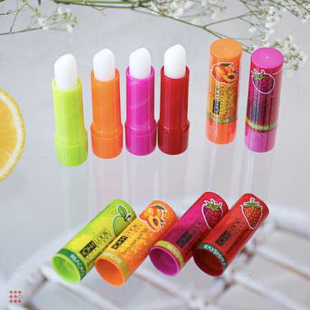 Помада не имеет цвета, при этом придает губам ухоженный и здоровый вид. Купить товар можно в одном из 4 ароматов: яблоко, клубника, малина, персик.