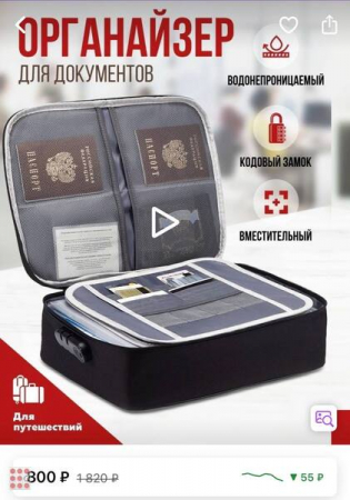 Сумка для хранения документов - отличный способ держать все документы в порядке и в одном месте, а также незаменимая вещь в путешествиях. Теперь все паспорта, дипломы, налоговые, медицинские и другие документы будут удобно разложены в органайзере и вам не придется долго искать важную бумагу.Преимущества органайзера для документов и вещей:- Сумку для документов удобно брать с собой в командировки и путешествия- Функция защиты от кражи с блокировкой паролем для защиты личных вещей (заводской пароль - 3 ноля (000))- Качественный износостойкий материал- Прочная обложка обеспечат сохранность документации и препятствует ее сминанию- Вы можете положить во второе отделение папки и бумаги формата А4- Сумка для хранения документов имеет специальный ремень для крепления на ручки чемоданаИспользуя органайзер для хранения документов, вы легко создадите полноценную систему аккуратного хранения вещей и документов.