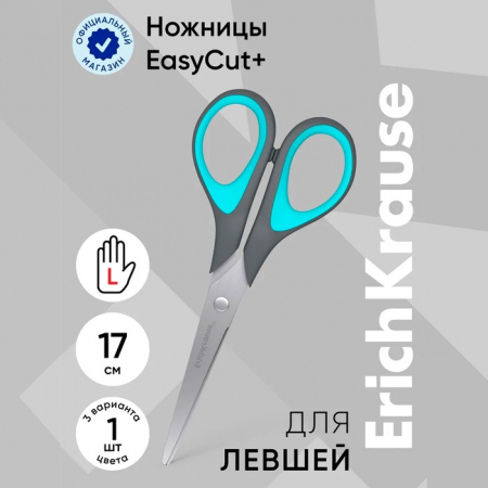 Ножницы ErichKrause EasyCut+, 17 см, для левшей, антискользящие резиновые вставки, европодвес,МИКС (арт. 10474297)