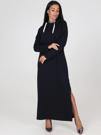 Стильное, современное и необычное платье из футера! Практичное платье-туника актуальной длины (миди) будет прекрасным вариантом для вашего повседневного гардероба. Прямой силуэт, длинный рукав, удобный капюшон. Для удобства движения на платье есть разрез. Стильное, беспроигрышное решение для городских будней.
