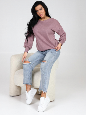 Женский джемпер изготовлен из полотна "ангора". Модель свободного покроя, плечо спущенное, длинный рукав на манжете, низ джемпера на поясе.