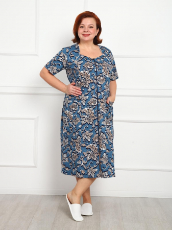 Халат домашний на молнии с коротким рукавом с рельефом по груди. Кокетка выполнена с атласным кантом. Имеются боковые карманы. Удлиненная модель с поясом в боковых швах.