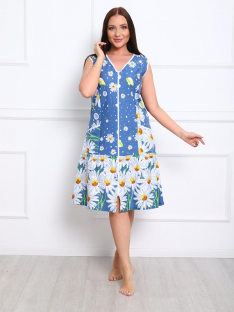 Женский халат выполнен из трикотажного полотна "кулирка-купон". Летний лёгкий халат на молнии, без рукавов, на боковых рельефах переда находятся настрочные карманы, горловина,вход в карманы и проймы обработаны бейкой контрастного цвета.
